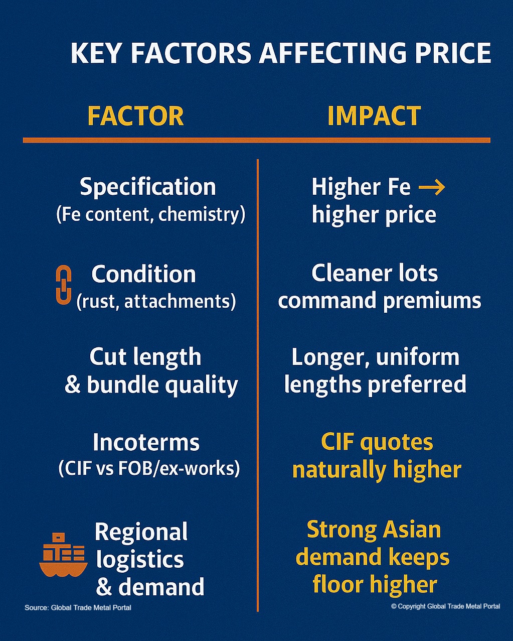 These specification factors directly affect price: better chemistry, clean condition, longer cut length, and consistent weight per meter reduce buyer risk and processing cost and therefore command higher prices.