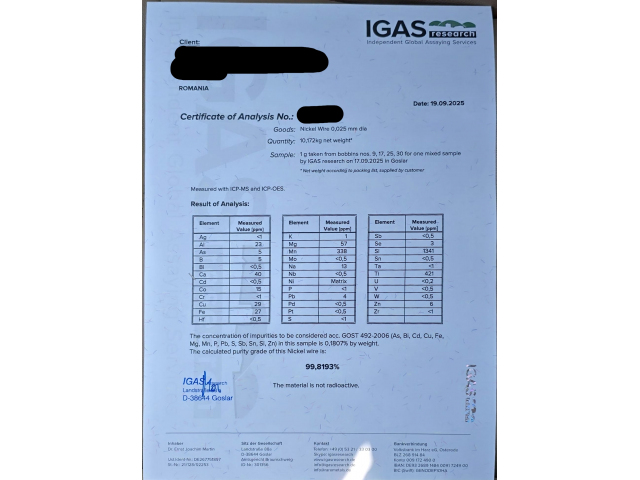 We can provide 10 kg (22.7 million metres) of nickel wire available with Igas Certification of Analysis, Evaluation, Deposit receipt and SKR from Igas, Property ownership and Origin Certificate.